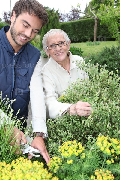 Молодой мужчина и пожилая женщина в саду