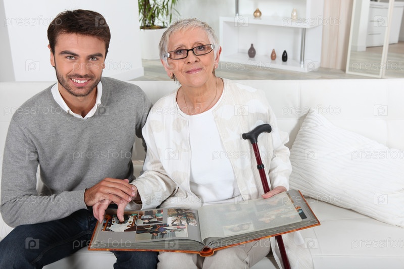 Пожилая женщина смотрит фотографии с сыном