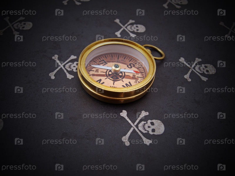 Медный компас на черном фоне с черепами