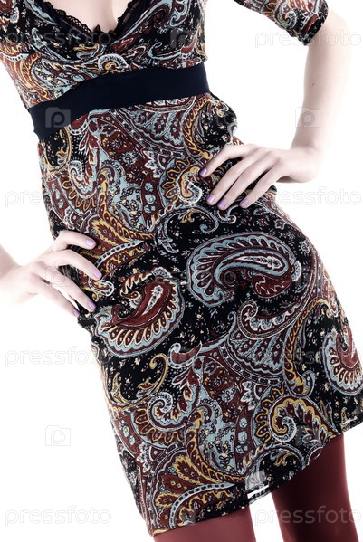 Тело женщины в платье с узором на белом фоне