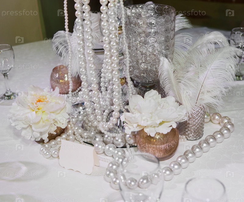 Стол, украшенный перьями, жемчугом и свечами