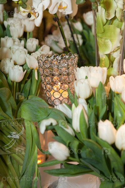 Хрустальный подсвечник среди белых тюльпанов