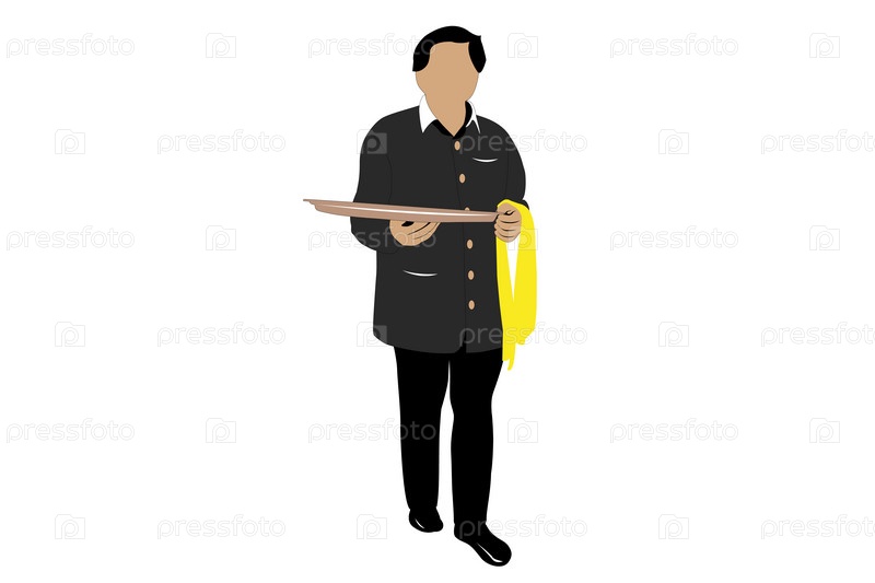 Официант без лица с пустым подносом стоит на белом фоне