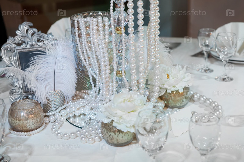 Стол, украшенный перьями, жемчугом и свечами