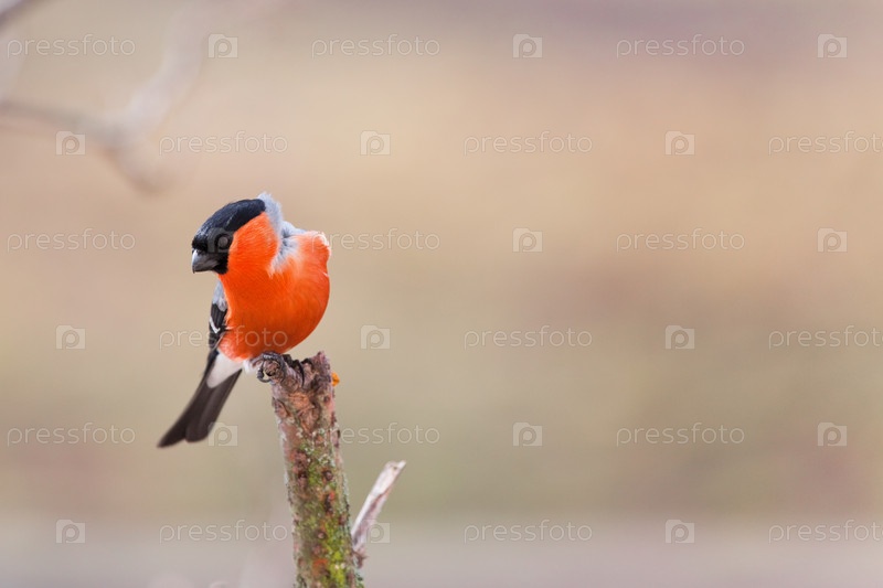 Яркий оранжевый самец снегиря сидит на ветке рябины при сильном ветре
