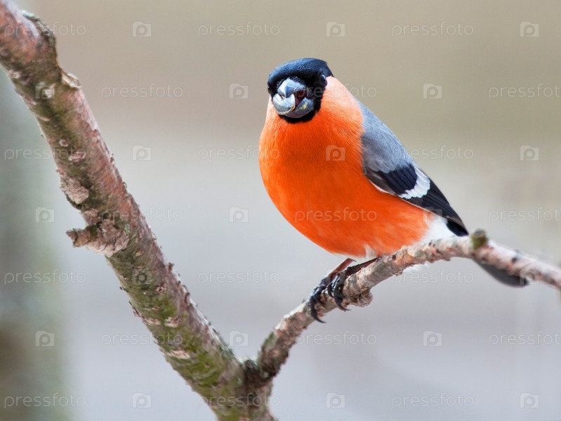 Яркий оранжевый самец снегиря сидит на ветке рябины с семечкой в клюве