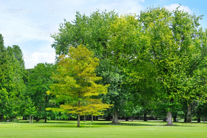 Летний парк с красивым зеленым лужайкам
