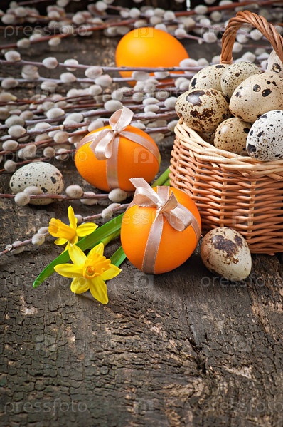 Пасхальные яйца на деревянном фоне