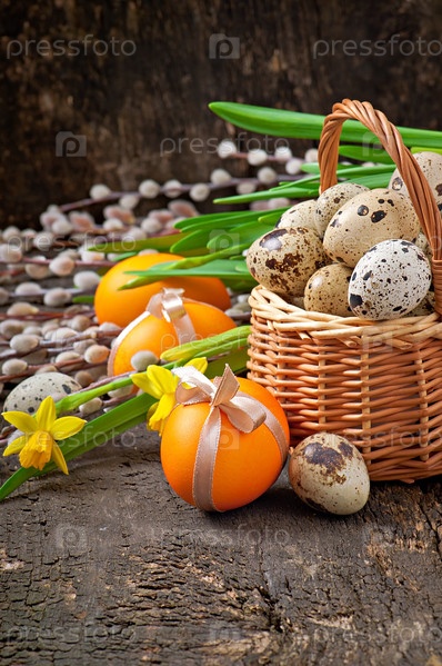 Пасхальные яйца на деревянном фоне