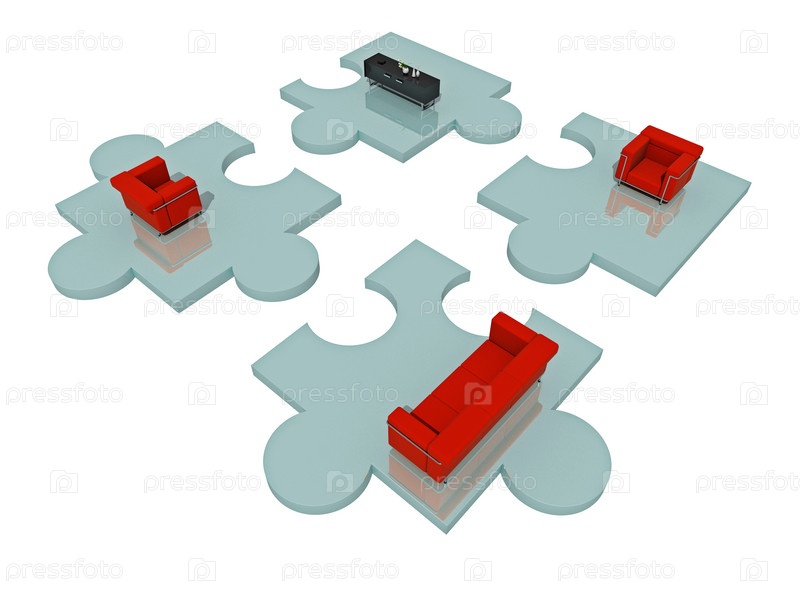 Загадки с современной мебелью, 3D-иллюстрация на белом фоне