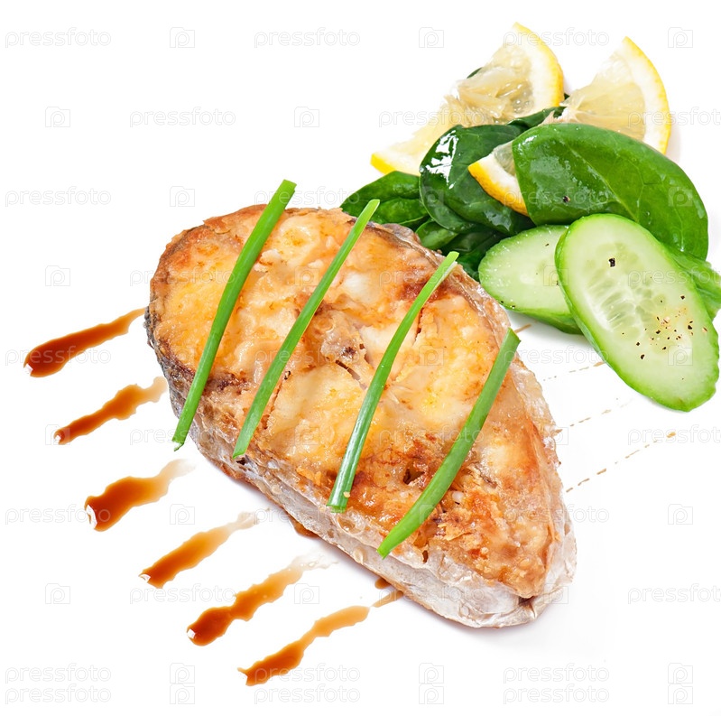 Рыбное блюдо - жареное рыбное филе с овощами на белом фоне