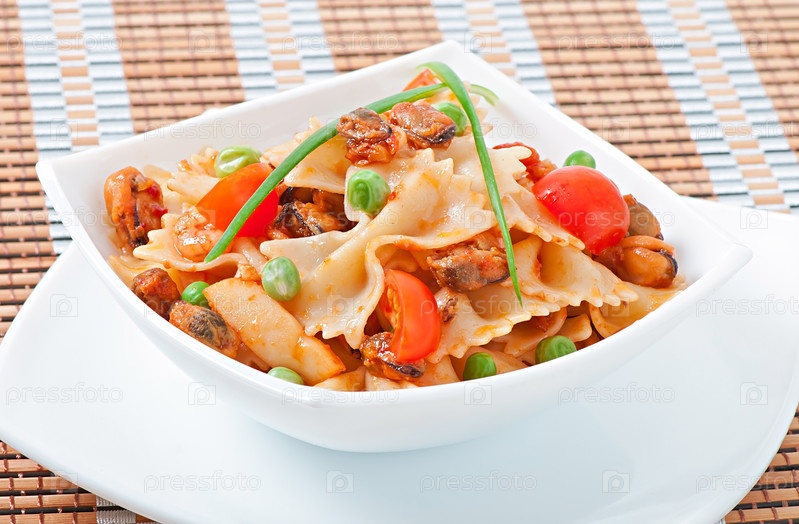 Паста Фарфалле с морепродуктами, помидорами черри и зеленым горошком