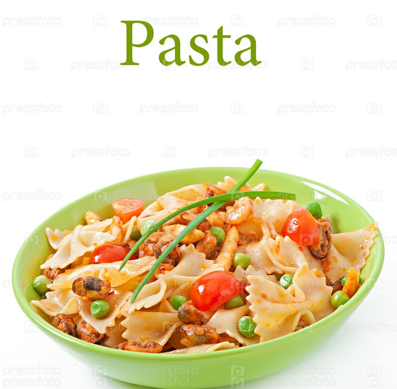 Паста Фарфалле с морепродуктами, помидорами черри и зеленым горошком
