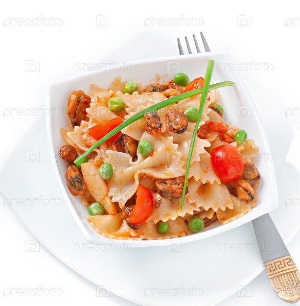 Паста Фарфалле с морепродуктами, помидорами черри и зеленым горошком