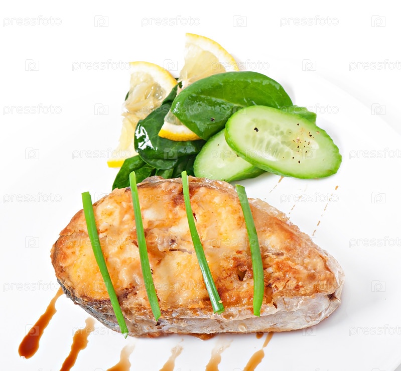 Рыбное блюдо - жареное рыбное филе с овощами на белом фоне