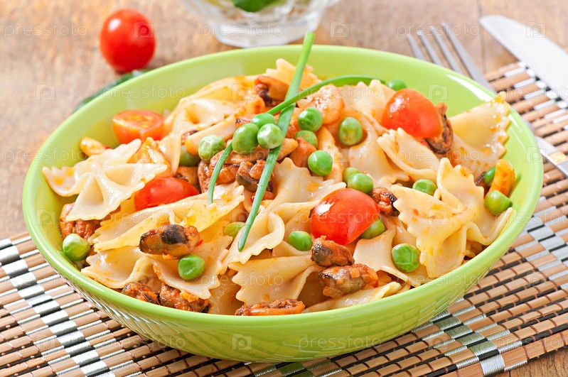 Паста Фарфалле с морепродуктами, помидорами черри и зеленым горошком