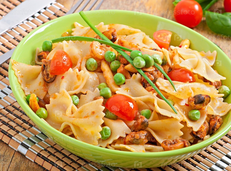 Паста Фарфалле с морепродуктами, помидорами черри и зеленым горошком