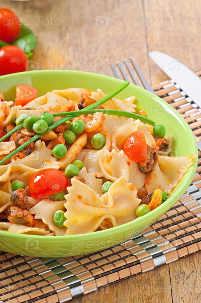 Паста Фарфалле с морепродуктами, помидорами черри и зеленым горошком