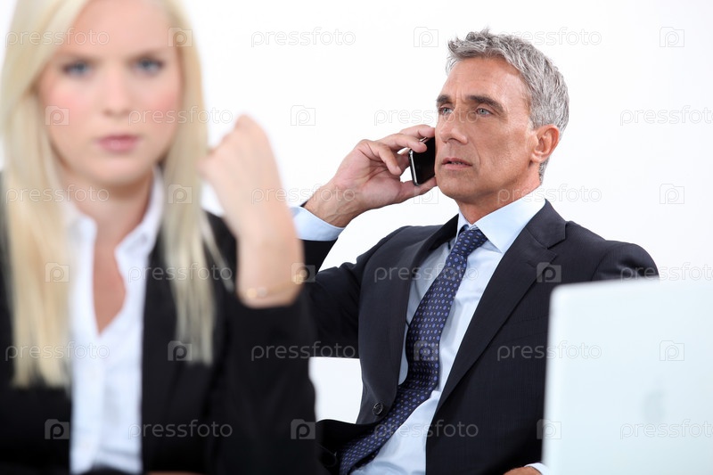 Директор говорит по телефону на белом фоне