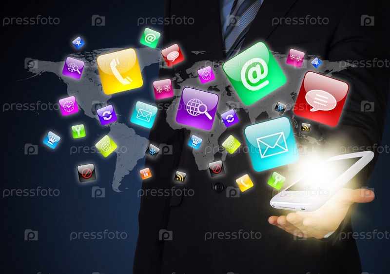 Человек в костюме держит в руке смартфон