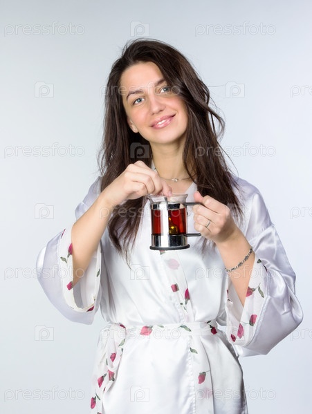 Женщина в халате с чашкой чая