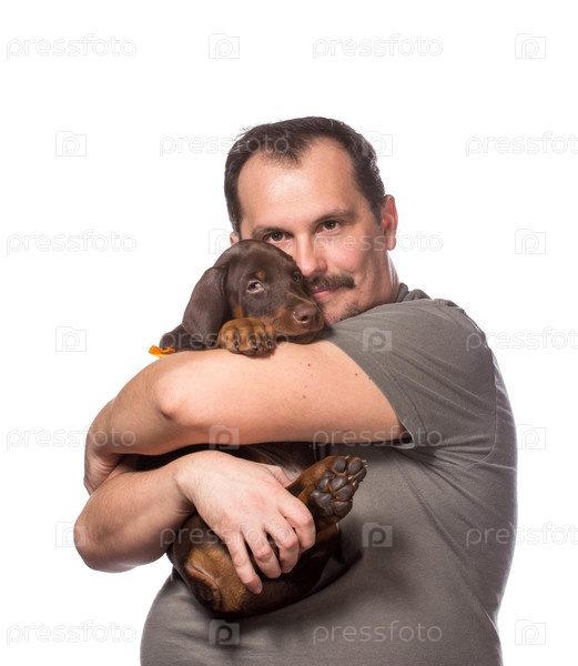 Взрослый мужчина со щенком на белом фоне