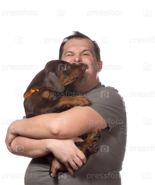 Взрослый мужчина со щенком на белом фоне