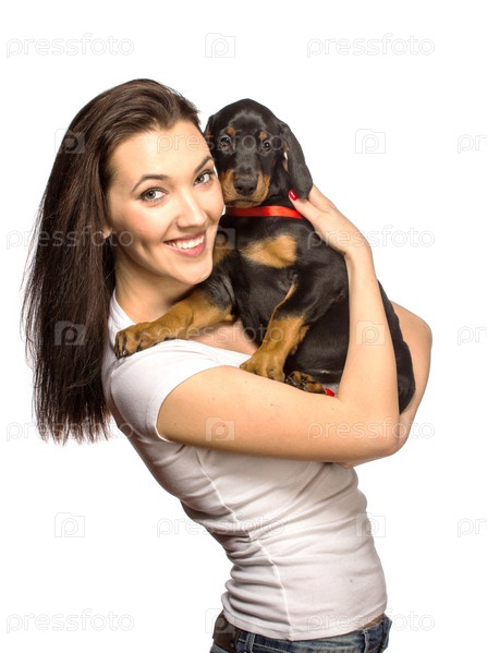 Брюнетка со щенком на белом фоне