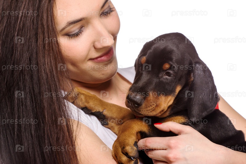 Брюнетка со щенком на белом фоне