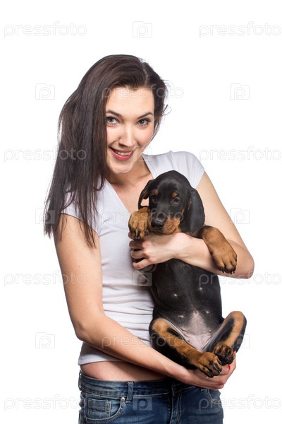 Брюнетка со щенком на белом фоне