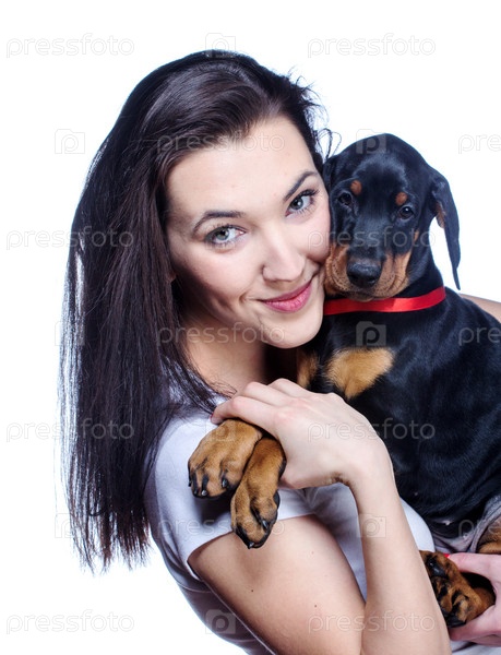 Брюнетка со щенком на белом фоне