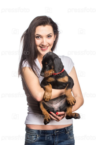 Брюнетка со щенком на белом фоне