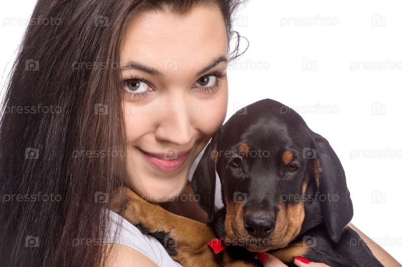 Брюнетка со щенком на белом фоне