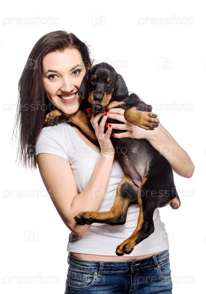 Брюнетка со щенком на белом фоне