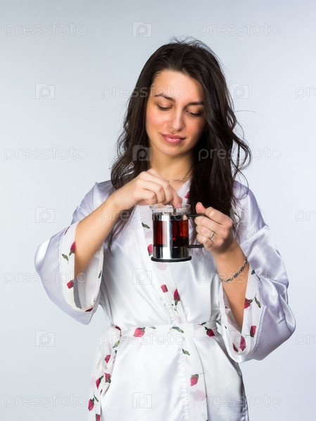 Женщина с чашкой чая в пеньюаре
