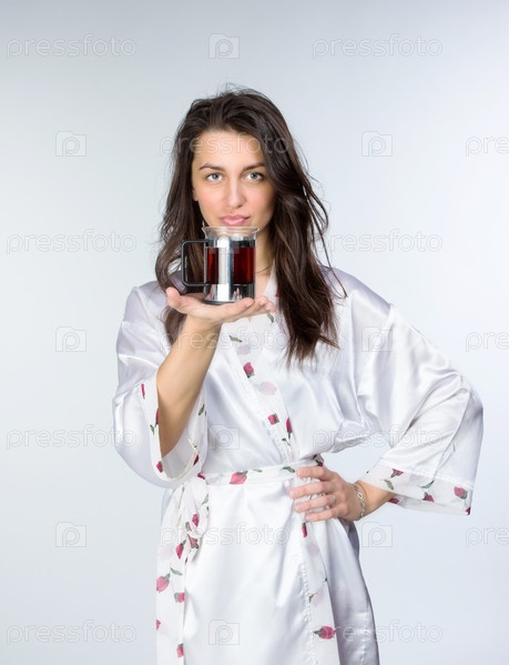 Женщина с чашкой чая в пеньюаре