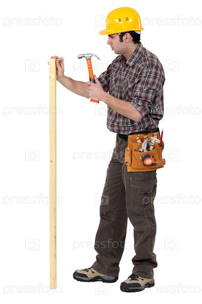 Строитель забивает гвоздь