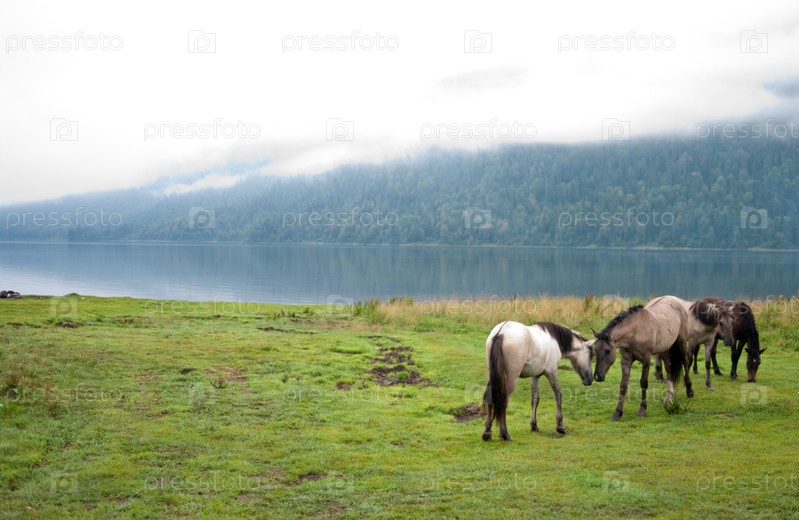 Лошади на берегу туманного озера