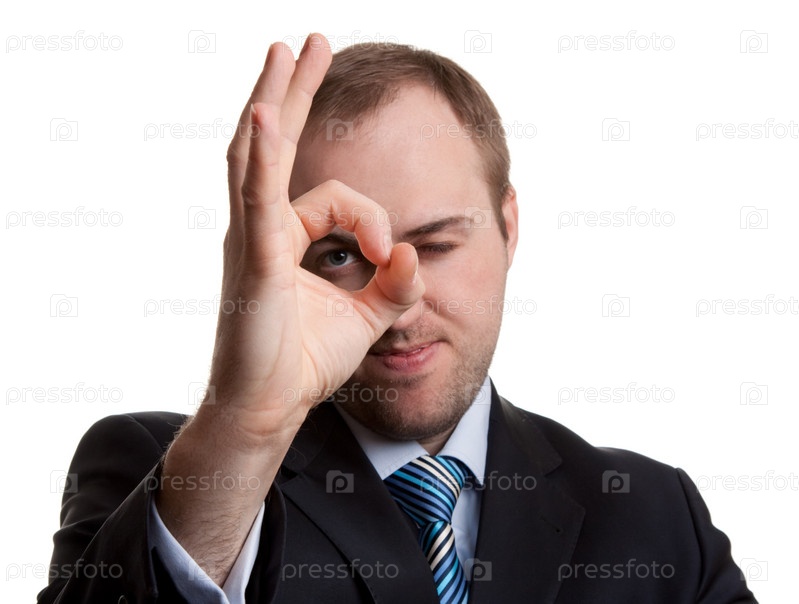 Небритый бизнесмен показывает жест ОК на белом фоне