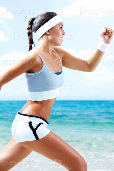 Спортивная девушка бежит на фоне океана