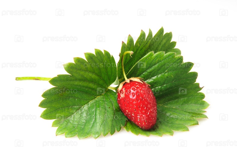 Спелая клубника с зелеными листьями на белом фоне