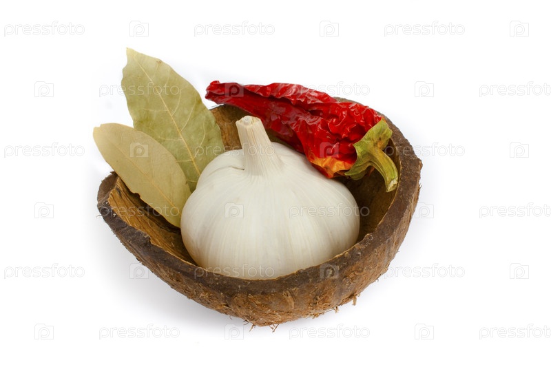 Чеснок, перец и лавровый лист в скорлупе кокосового ореха