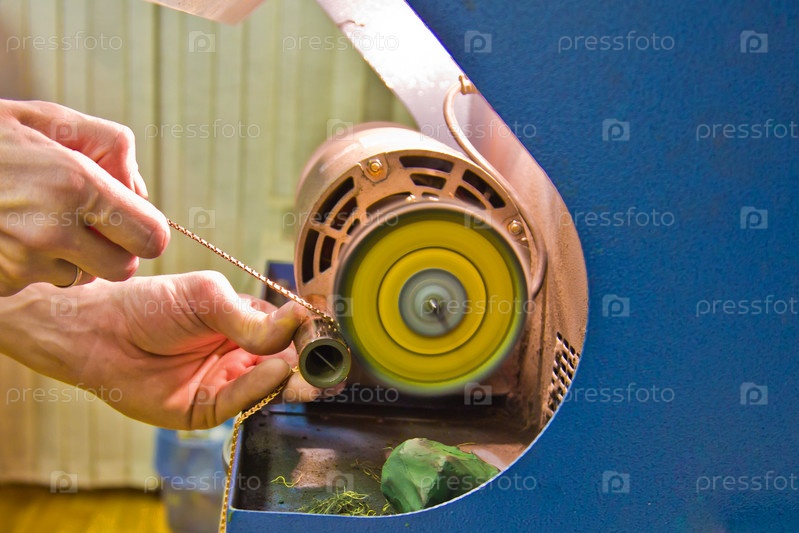Ювелир шлифует золотую цепочку на шлифовальном станке