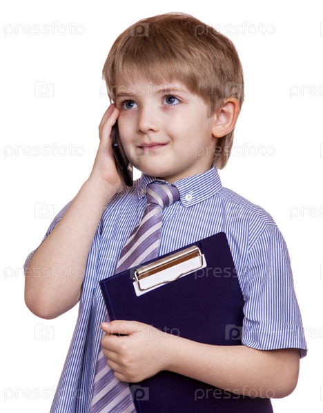 Маленький бизнесмен с телефоном и папкой