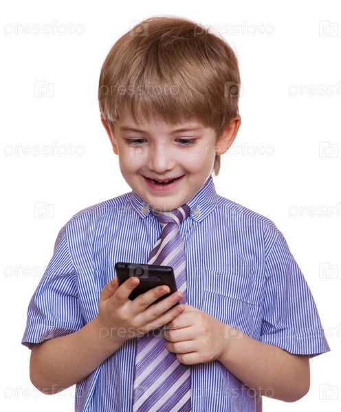 Маленький мальчик в рубашке смотрит на телефон