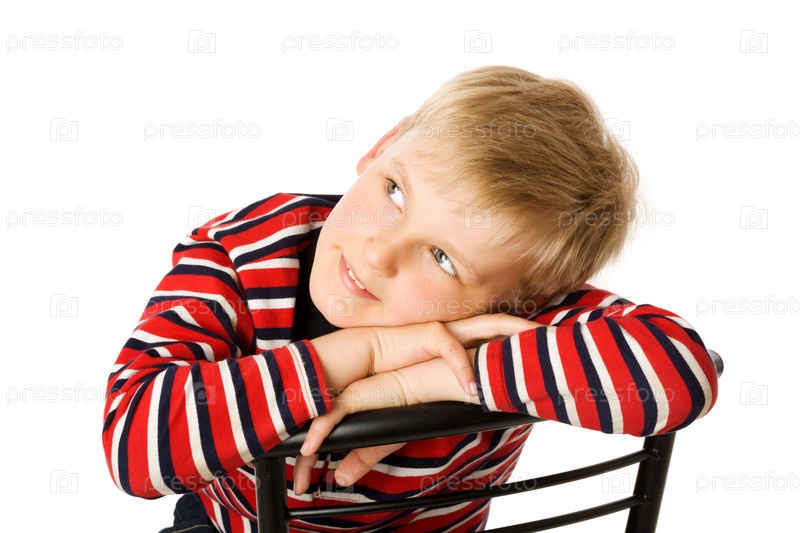 Семилетний мальчик мечтает, облокотившись на спинку стула