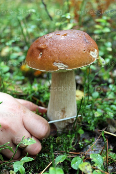 Рука с ножом срезает красивый гриб
