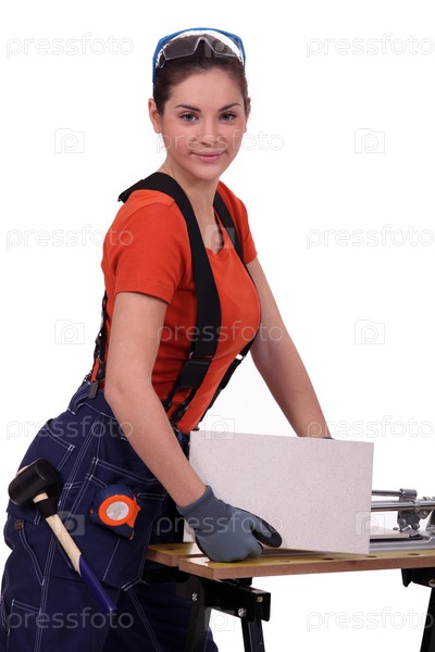 Женщина режет плитку