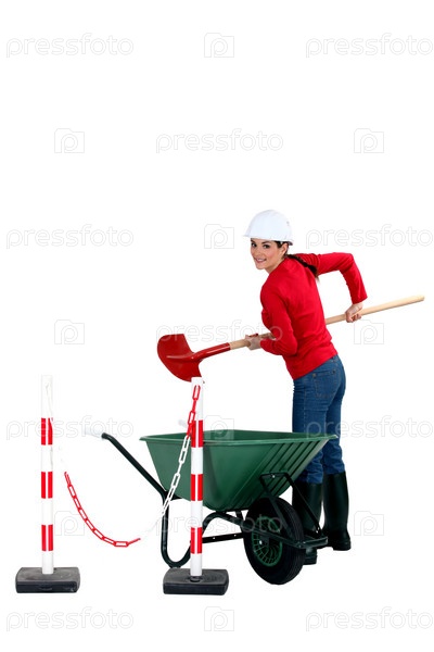 Рабочий с тачкой и лопатой