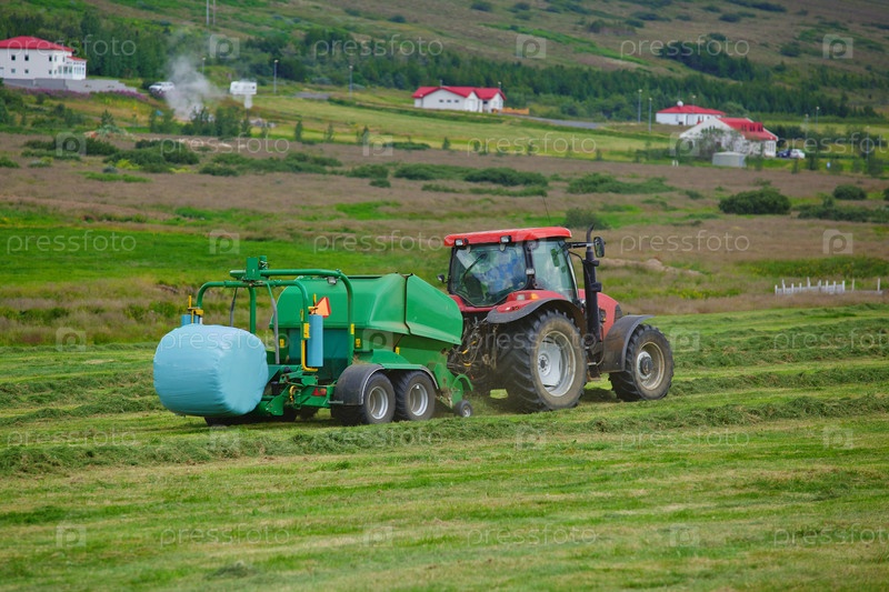Трактор собирает сено